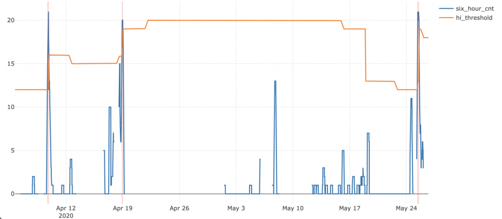 Using this analysis, a dynamic threshold can be assigned based on how many surge events for this chiller is normal over a period of time. This is accomplished by finding a high quantile over an historic period, such as the 98% quantile over the previous 30 days, and alerting on surges above that amount (Figure 3).